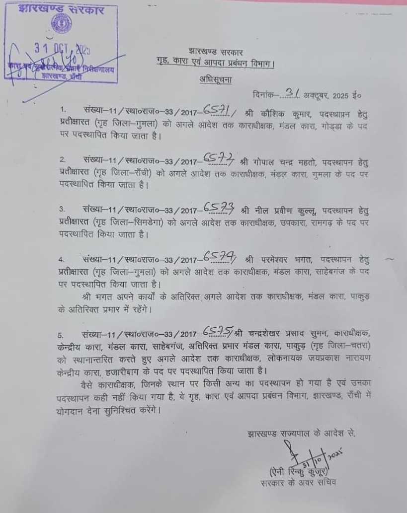 विभाग ने आदेश में कहा है कि जिन अधिकारियों के स्थान पर नए काराधीक्षकों की नियुक्ति कर दी गई है और जिनका नया पदस्थापन नहीं हुआ है, वे गृह विभाग, रांची में तुरंत योगदान दें।