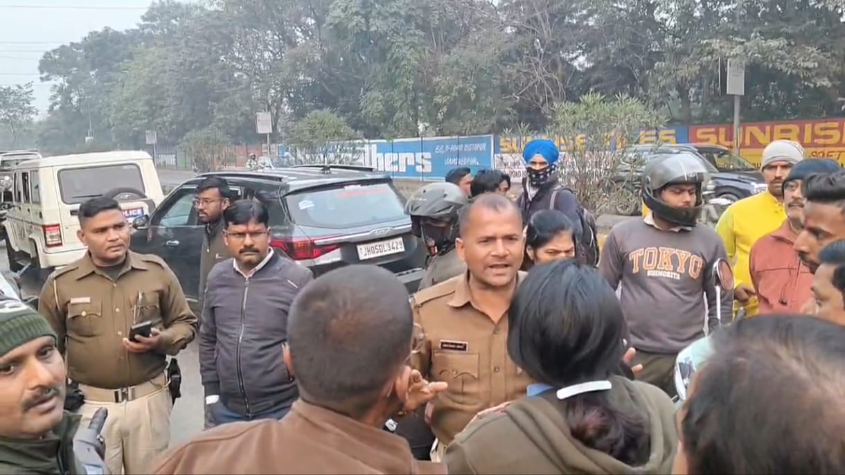जमशेदपुर : बिष्टुपुर थाना अंतर्गत साईं मंदिर के पास शनिवार को ट्रैफिक चेकिंग के दौरान उस समय माहौल तनावपूर्ण हो गया, जब एक दंपती पुलिस के कथित अमानवीय व्यवहार का शिकार हो गए। इस घटना में स्कूटी सवार महिला गंभीर रूप से घायल हो गई। उसे स्थानीय लोगों की मदद से अस्पताल में भर्ती कराया गया है।मिली जानकारी के अनुसार आदित्यपुर के रहने वाले दंपती स्कूटी से सोनारी की तरफ जा रहे थे। इसी दौरान साईं मंदिर के पास ट्रैफिक जांच में तैनात पुलिस कर्मियों ने उन्हें रोकने की कोशिश की।
