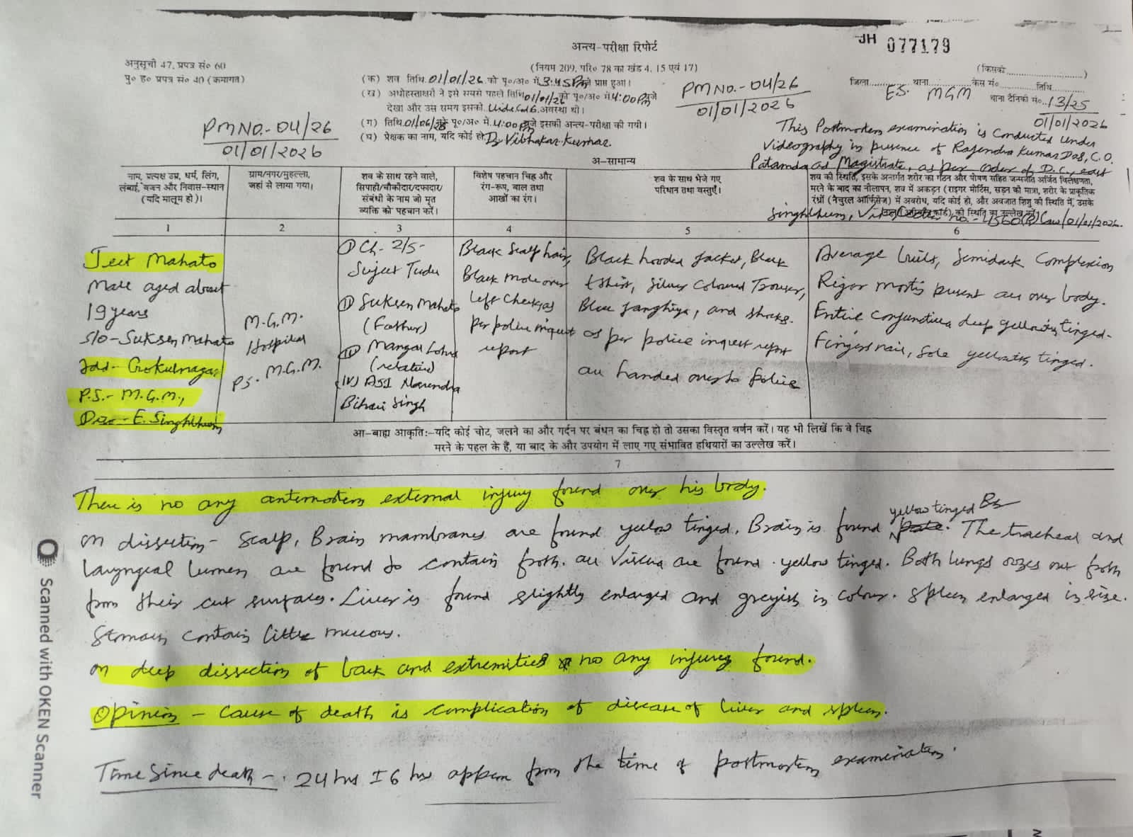प्राप्त जानकारी के अनुसार, जीत महतो को इलाज के लिए एमजीएम अस्पताल में भर्ती कराया गया था, जहां उसकी मौत हो गई। इसके बाद पूरी प्रक्रिया का पालन करते हुए पोस्टमार्टम वीडियोग्राफी की निगरानी में कराया गया।