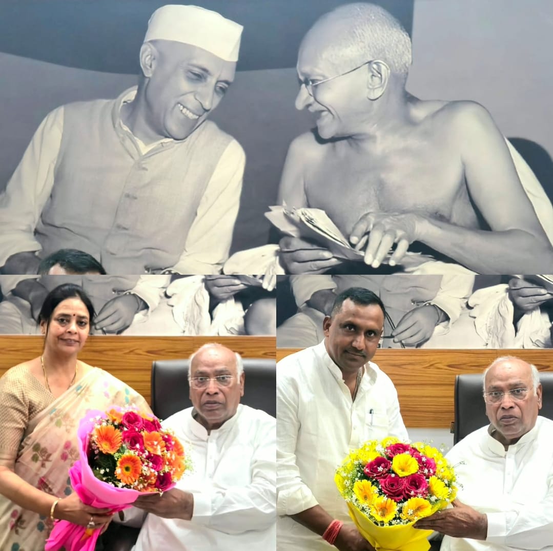 नई दिल्ली : मानगो नगर निगम की नव-निर्वाचित मेयर सुधा गुप्ता एवं वरिष्ठ कांग्रेस नेता एवं पूर्वमंत्री बन्ना गुप्ता ने आज कांग्रेस के राष्ट्रीय अध्यक्ष मल्लिकार्जुन खरगे से शिष्टाचार मुलाकात की। इस दौरान खड़गे ने दोनों नेताओं का गर्मजोशी से स्वागत किया और जीत की बधाई दी।